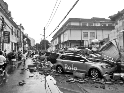 本报安阳讯 昨日12时40分,安阳市天空陡暗,随后电闪雷鸣,大雨如注。在近1小时的暴雨中,有些道路不同程度被淹,不少车辆被淹在路上。该市文峰北路附近一家单位的院墙在雨中倒塌,有7辆汽车被砸。