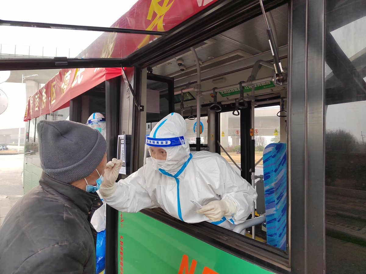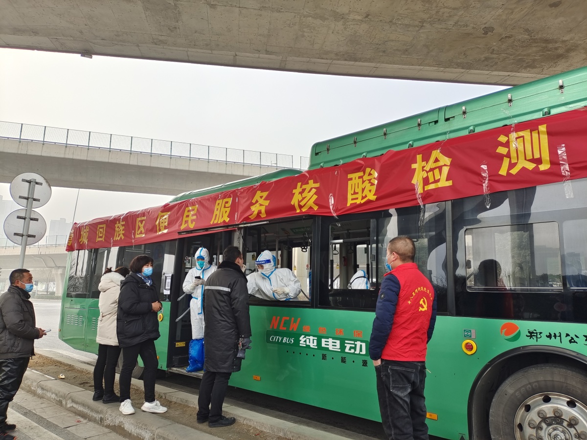 近日,在郑州街头人员较为集中的区域,可以见到一些12米长的纯电动公交车停靠,随即医护人员与公交志愿者一起,打开车门或车窗开始机动巡回为周边居民群众进行核酸检测采样。