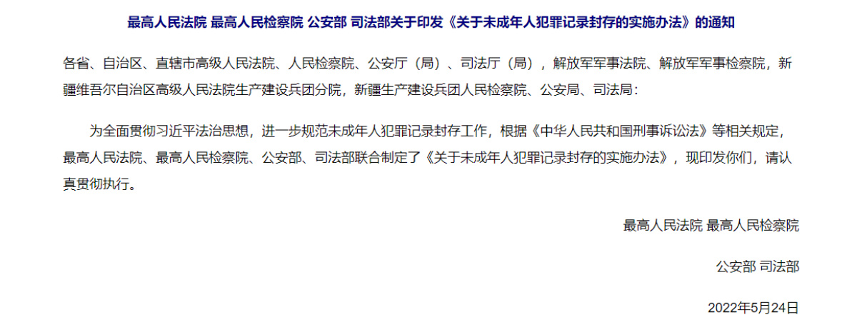 5月30日,最高人民法院、最高人民检察院、公安部、司法部会签下发了《关于未成年人犯罪记录封存的实施办法》,明确涉及未成年人案件的材料“应封尽封”。