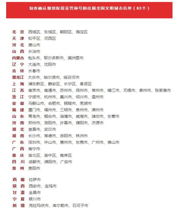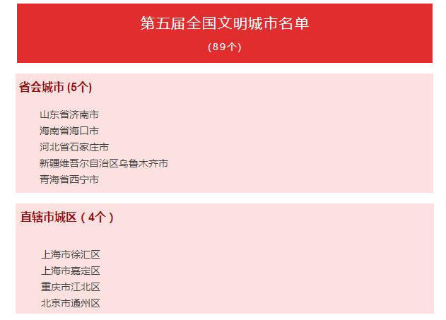 2017年8月以来,中央文明办根据中央文明委2017年版《全国文明城市测评体系》,按照城市自主申报、省级择优推荐、中央部委审核、组织综合测评、听取市民意见、进行综合计分、媒体集中公示等评选程序,严谨规范组织第五届全国文明城市评选工作,以实地暗访考察、入户问卷调查和网上材料审核三种方式对166个参评城市进行测评,严格依据参评城市的2015、2016、2017年三年测评总成绩排名,报中央文明委领导批准,提出第五届全国文明城市名单。同时,中央文明办按照城市进行自查、省级审查推荐、中央部委审核、组织复查测评等复查程序,认真做好往届全国文明城市复查工作,严格依据中央文明办组织的网上材料审核结果和委托各省、自治区、直辖市文明办组织的实地暗访考察、入户问卷调查结果,提出对往届全国文明城市的复查建议,报中央文明委领导批准。现将第五届全国文明城市名单和复查确认继续保留荣誉称号的往届全国文明城市名单公布如下: