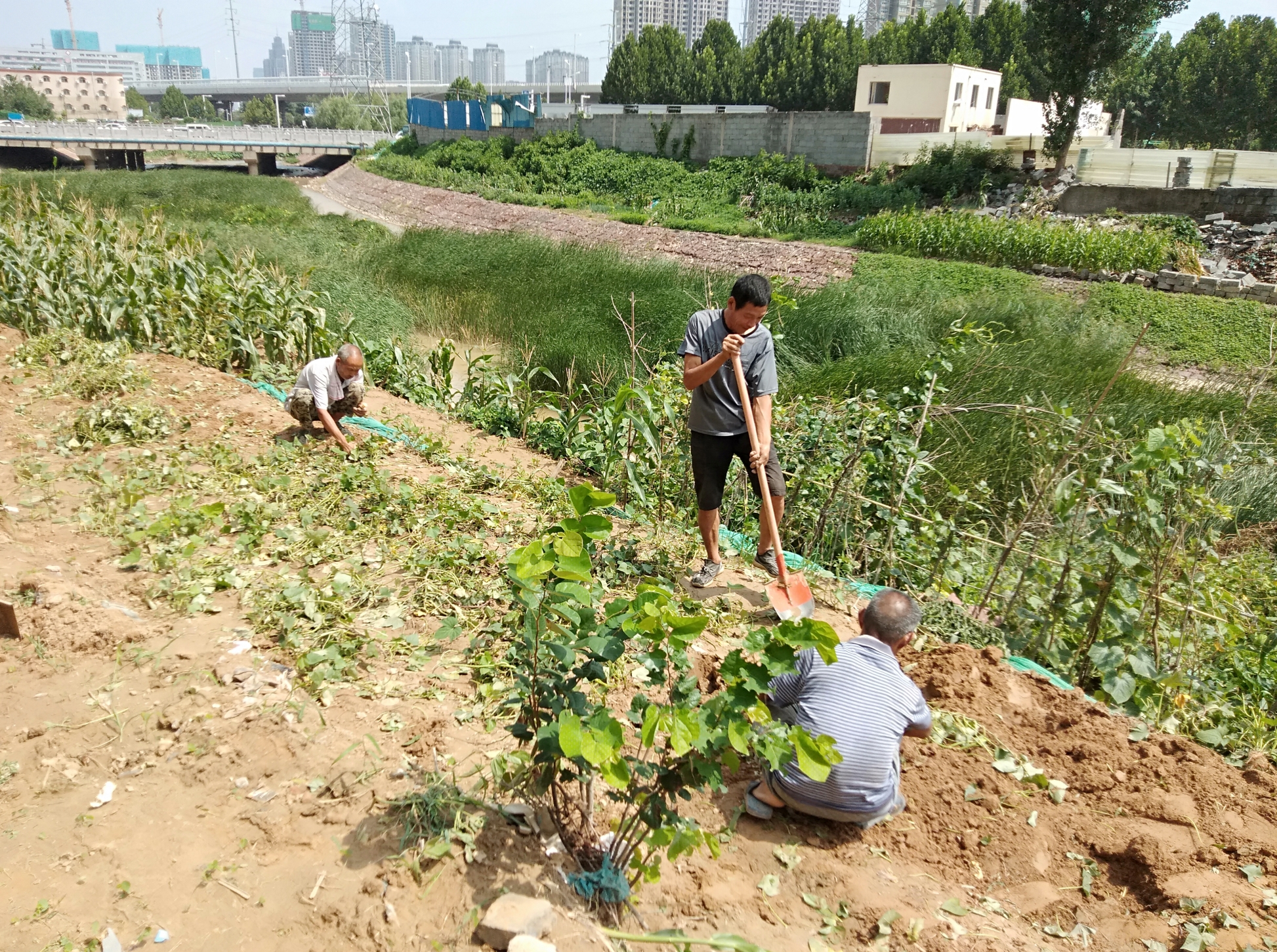 沿着西三环丹青路交叉口一直往南,河道西侧,多名工人正在清理岸上种植的红薯、花生、芝麻等农作物。一名工人解释,此段金水河畔正在绿化,啥庄稼也不能长了,很多已经结出果实了,拔掉挺可惜的。