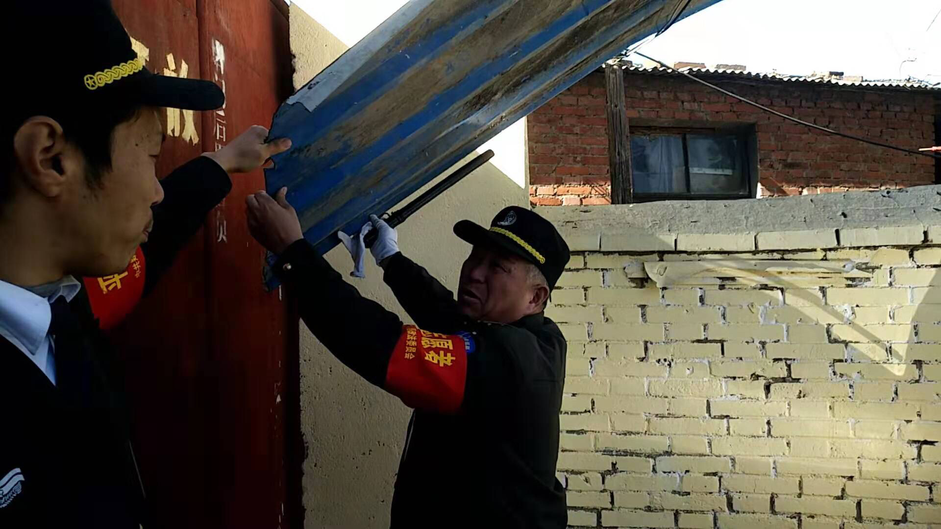巡防员王永和队友走过去,试图将铁皮拉下来,以免被风吹落后伤及行人。可用力拉了几次,发现铁皮的边缘因比较锋利,两端已经深深扎进了树干里,根本拽不动。