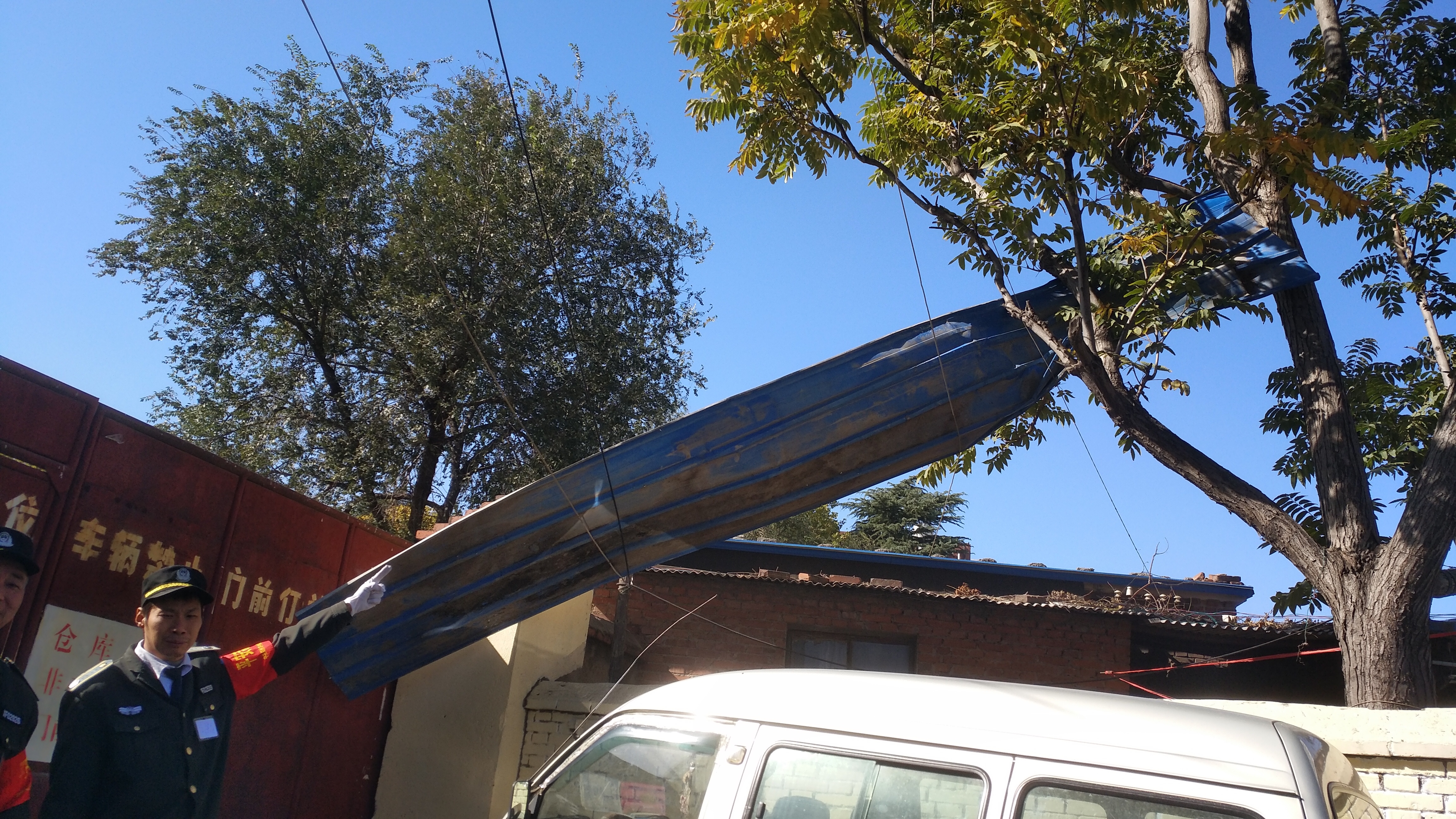 经查,该铁皮是从工地上的一座简易房顶上刮下来的。幸亏被树干卡住,否则后果不堪设想。目前,此事正在处理中。