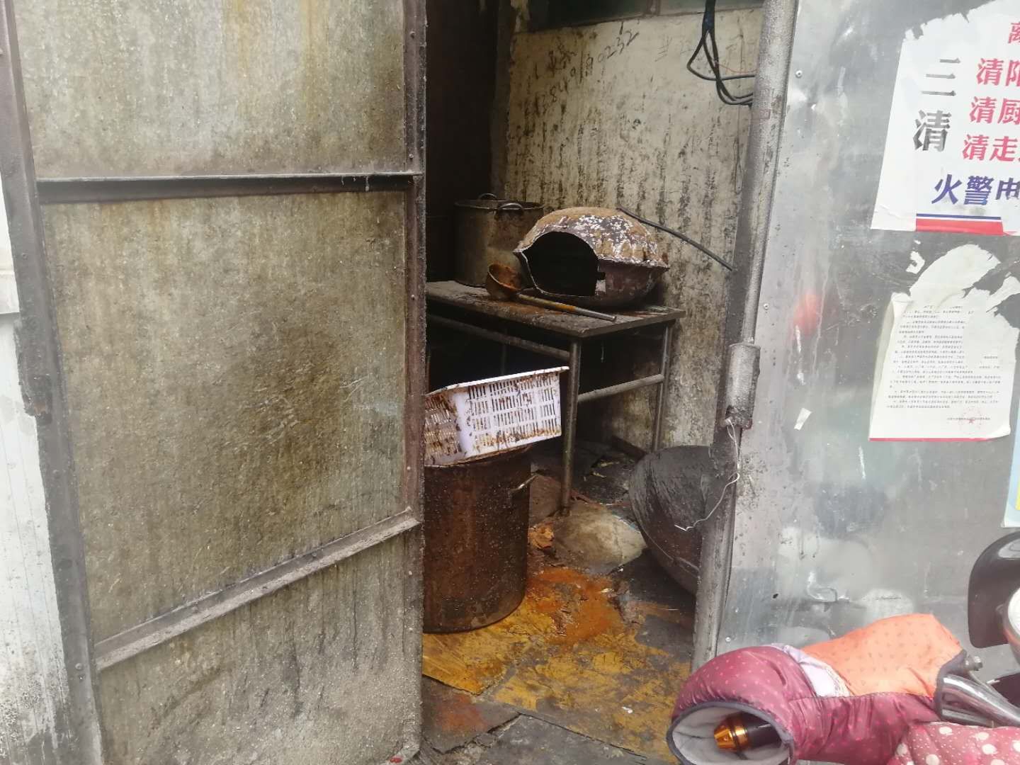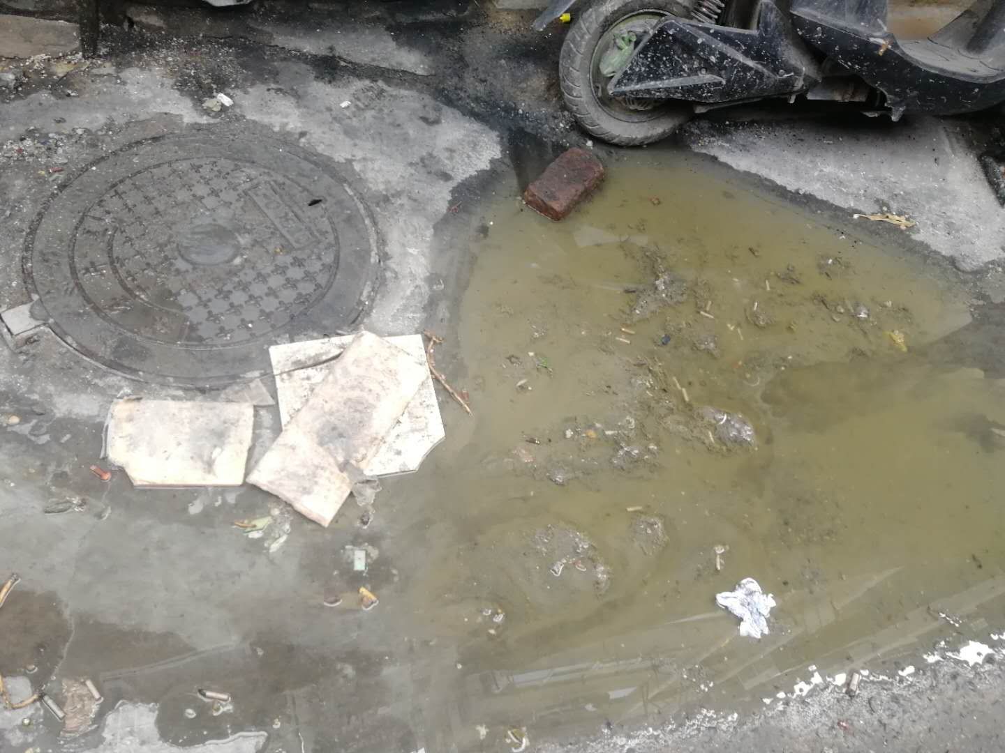铁皮房的正上方搭了一个遮雨棚,遮雨棚下的路面多处出现油污或污水。而在铁皮房四周,黄色的污水散发着刺鼻的臭味,正慢慢地向路上流出,在一片低洼处汇聚成约1平方米大的臭水坑。一处污水井已被餐厨垃圾堵塞,污水从境内往上冒。不少从此处经过的居民,大多捂着鼻子快速通过。