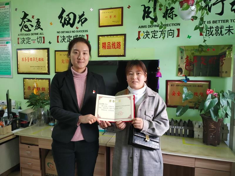 12月16日中午,在郑州市21路调度室内,一名年轻女子从公交二公司二车队副书记崔晨手里接过了“最美小姐姐”的奖状。