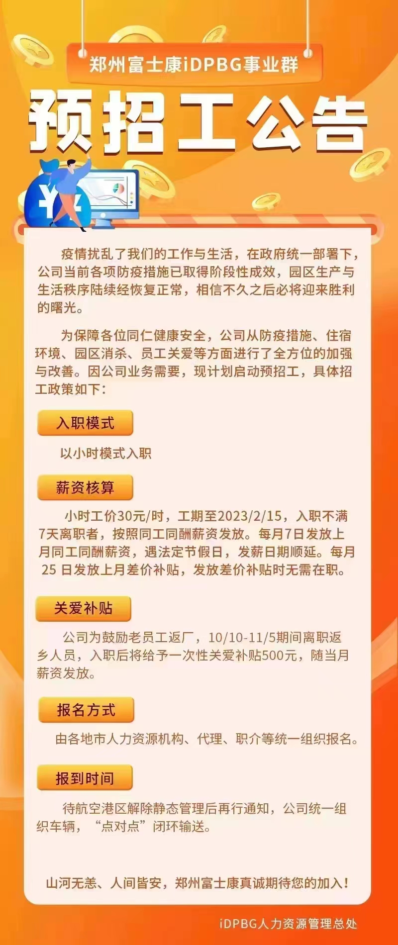 大河财立方记者同步获悉,郑州富士康iDPBG事业群也于昨日发布了预招工公告,该公告提到,在政府的统一部署下,公司当前各项防疫措施已取得阶段性成效,园区生产与生活秩序陆续恢复正常。