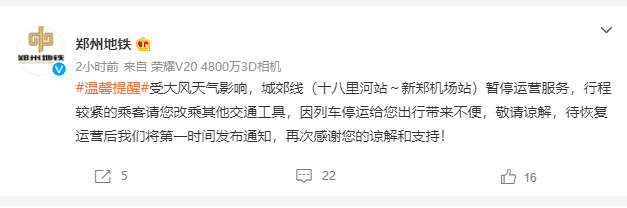 【大河财立方消息】11月7日早间,据郑州地铁官方微博消息,受大风天气影响,11月7日6时起,城郊线(十八里河站-新郑机场站)暂停运营服务,有相关行程计划的乘客建议您改乘其他交通工具,给您出行带来不便,敬请谅解,待恢复运营后将第一时间发布通知。