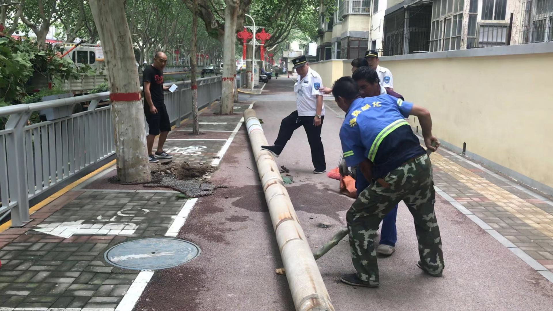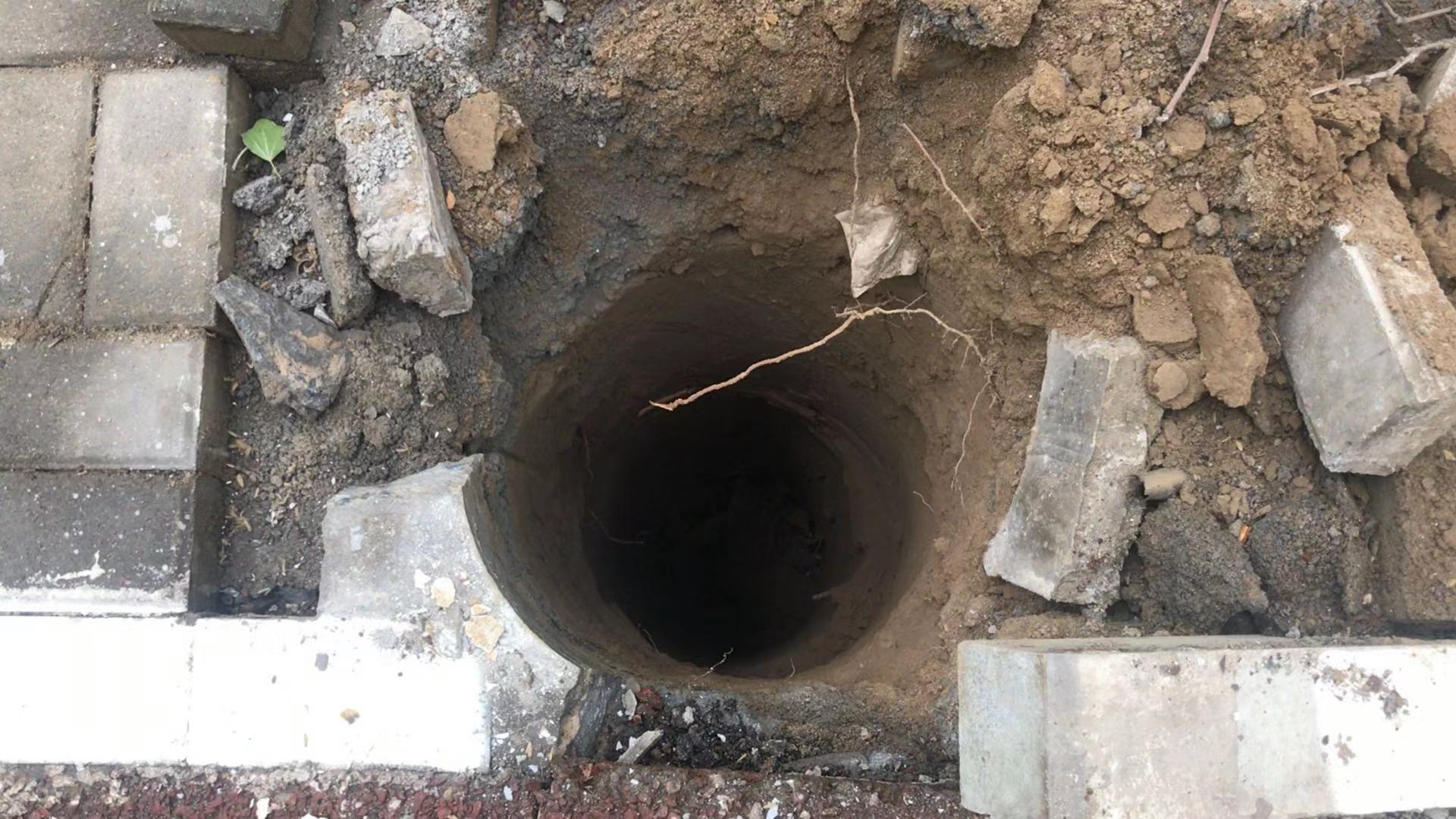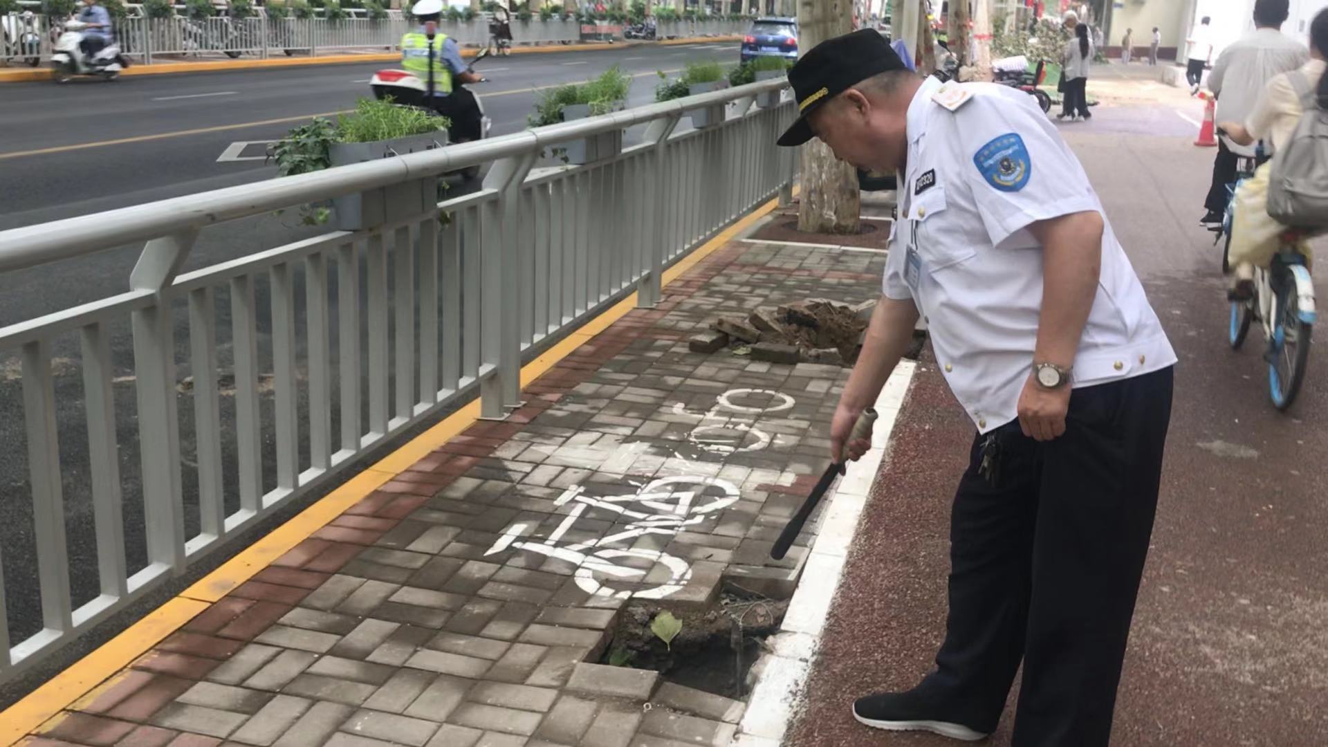 巡防队员跟随求助市民薛女士赶到现场,在路边一家银行门口人行道边一处,看到人行道两侧共留下4个线杆深洞,不少老年人从旁边通行很不安全。