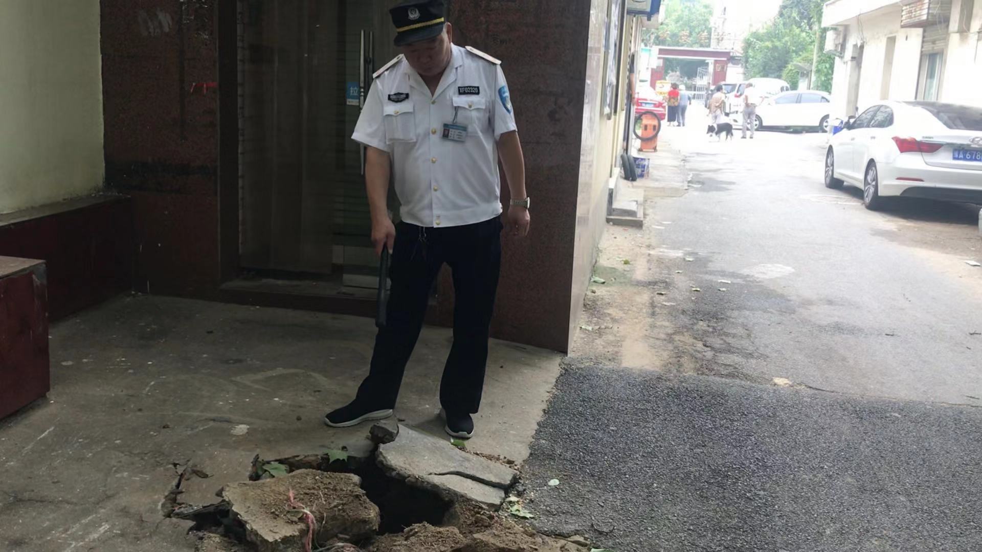 紧接着,巡防队员又一路向西走了50米,在一家小饭店门口和小区大门口两侧又看见4个线杆深洞未填平。
