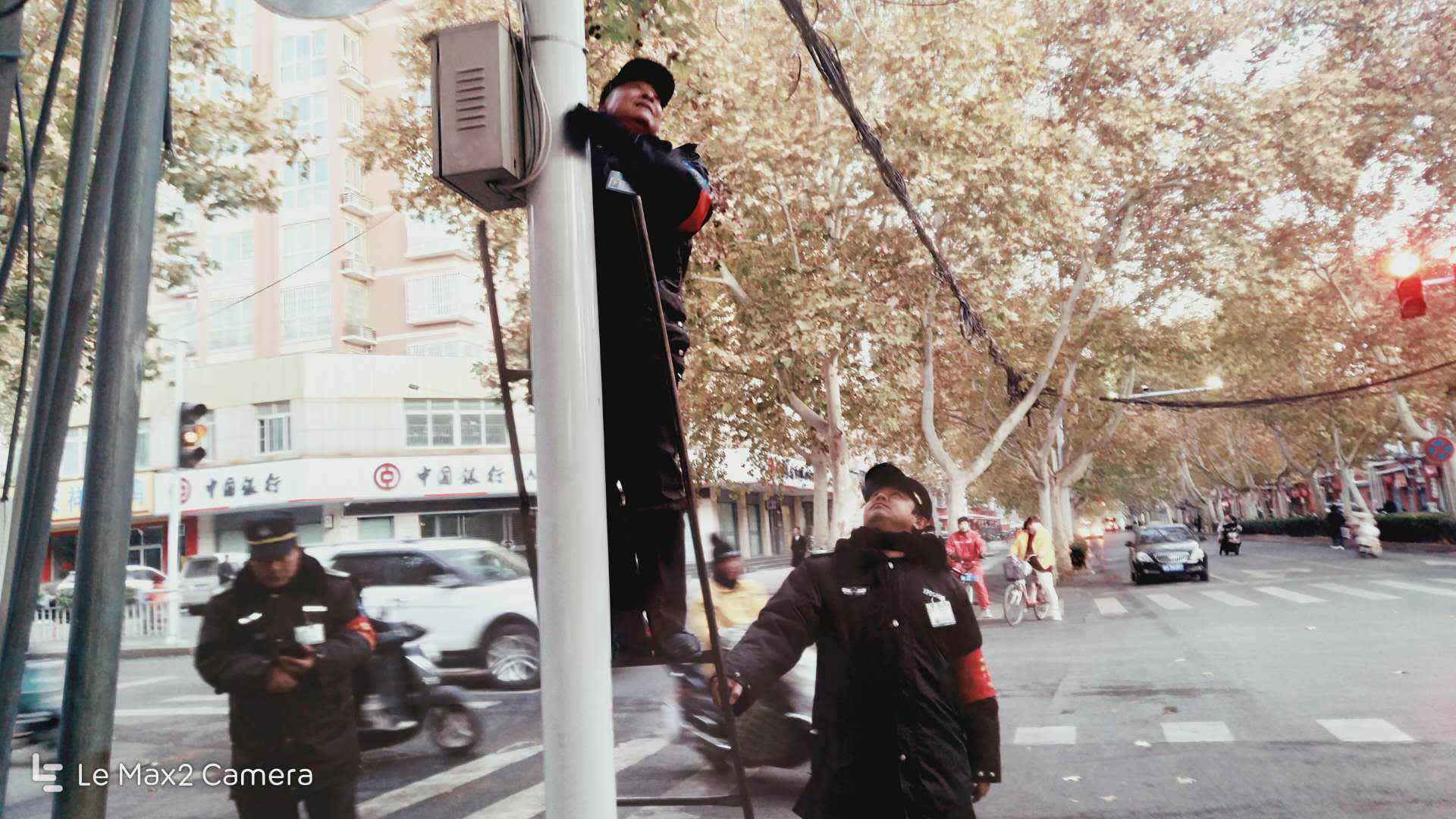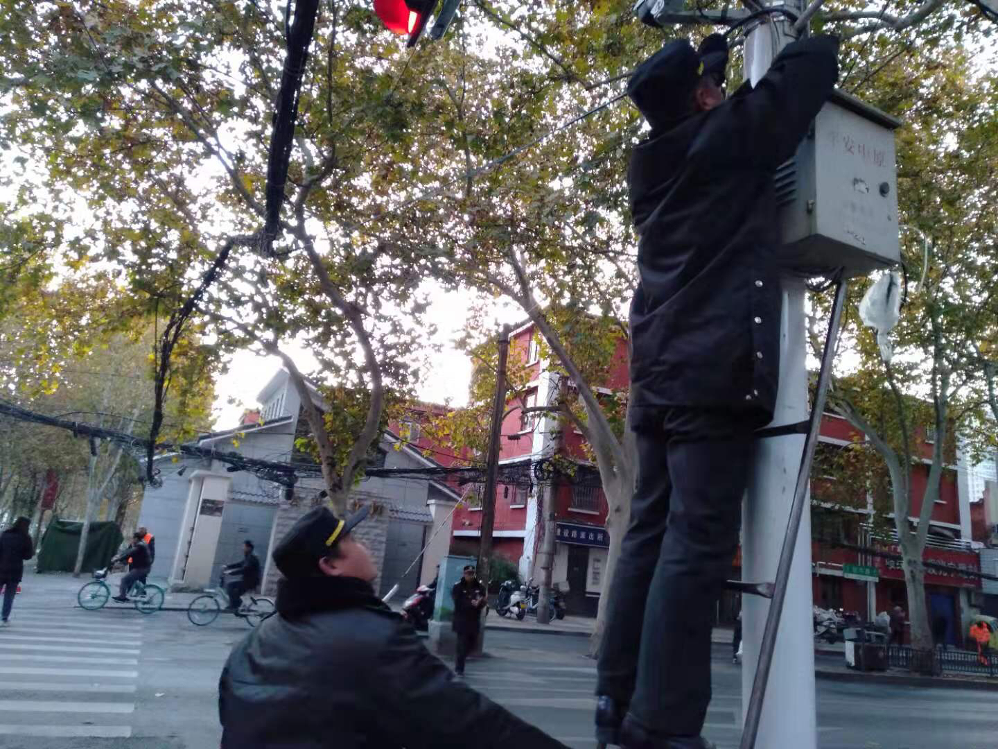 宋世岗、张云峰看到情况紧急,连忙过去将线缆拉起指挥交通,提醒车辆慢行通过。这时,另一组队员陈志强和刘明群也巡逻到此,四人一边指疏导交通,一边找来梯子,将两根脱落的电缆线暂时绑到路边的信号灯杆的顶端,以提升线缆的高度,使过往的公交车也能安全通过。