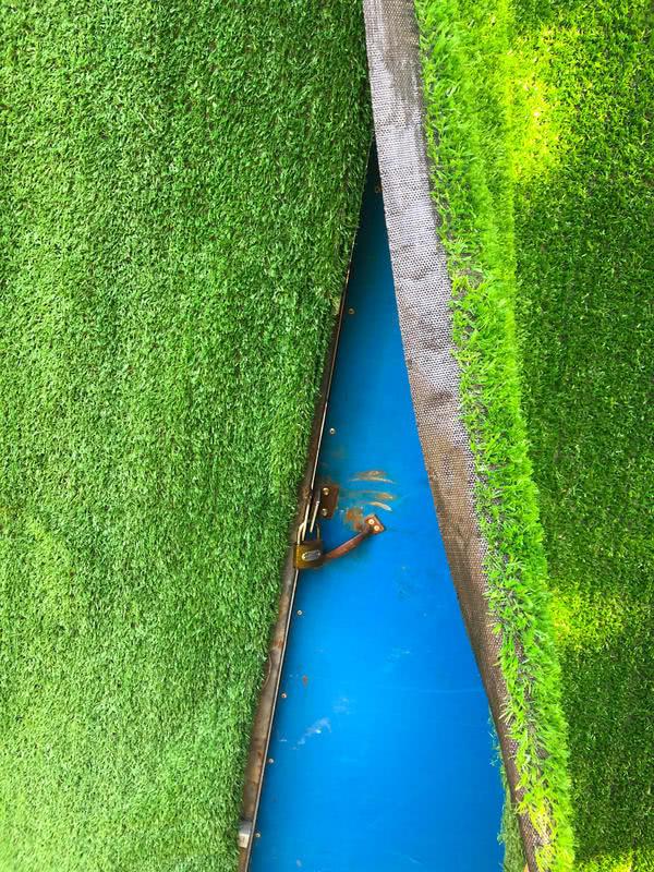 记者在现场发现,这块地方被分成了两个院子,另一面院子大门被绿色的草皮全部覆盖,如果不认真寻找,真的难以发现另一面院子有门。当记者上前敲门询问时,一位大妈出院子锁上门说道:“这个地方是我们的打扫卫生放置工具的仓库,这个院子领导都知道,你找领导去问问吧。”