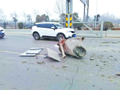 事发现场,位于西三环郑上路立交桥由西向东上桥口处。当天上午8点多钟,记者在现场看到,一个直径约1.5米的半圆锥形铁器,掉落立交桥上桥路面,其上方,限高杆横梁遭受巨大撞击后,变形成V字形。安装在限高杆上的两块太阳能光板、爆闪指示灯以及监控探头等,从上面脱落后,被过往车辆碾得粉碎。由于这个庞然大物丢弃路面,郑上路立交桥的车辆堵了数百米。
