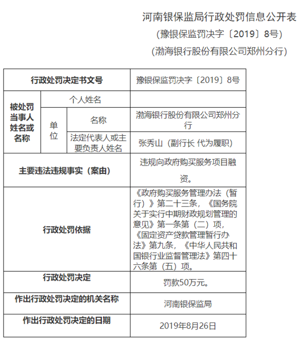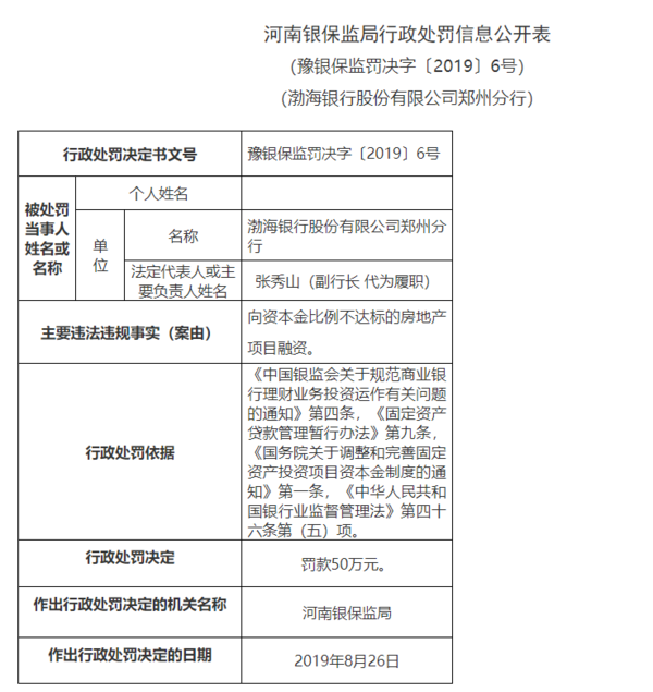 罚单显示,因向资本金比例不达标的房地产项目融资、违规为房地产项目提供融资、违规向政府购买服务项目融资等3大违规事由,渤海银行股份有限公司郑州分行及张秀山(副行长 代为履职)收到河南银保监局3张罚单,合计被罚150万元。