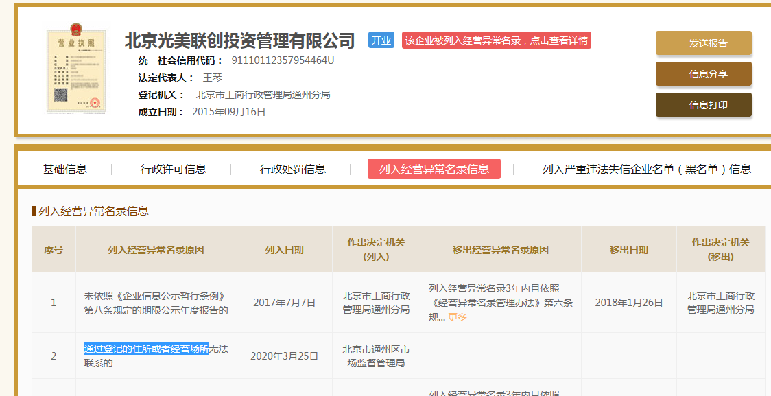 ◆进展:股东法人被列入经营异常名录,卫生监督部门已介入