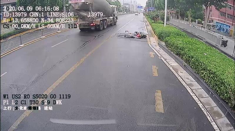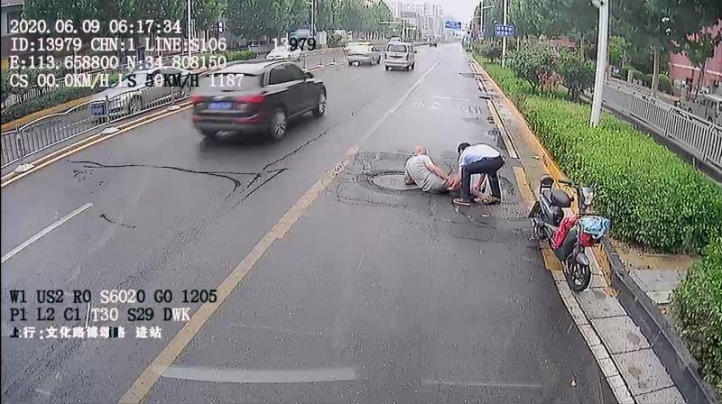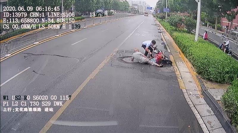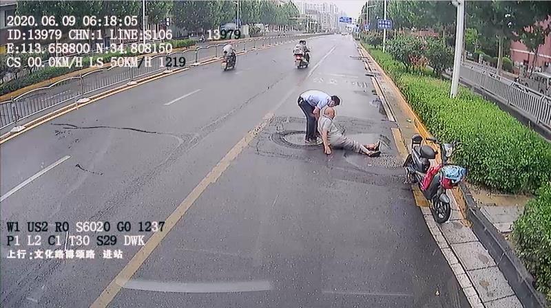 6月9日早上6时15分许,郑州S106路公交车长赵增华驾驶公交车行驶至文化路博颂路站时,远远看到站牌前方50米处有一位老人躺在快车道上的一个水坑中。电动车也压在老人身上。