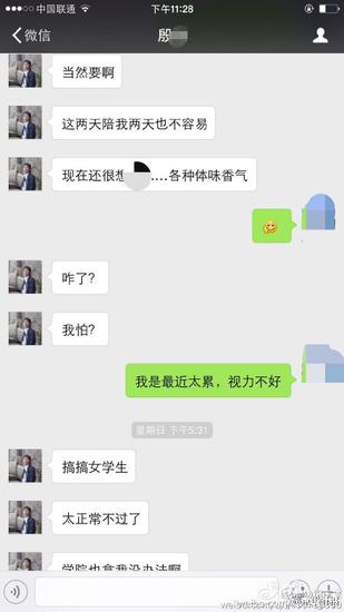 【天津工业大学老师骚扰女学生?校方:涉事老师暂停职待查】@hello小女士 在微博晒出@天津工业大学 一教师骚扰威胁的微信截图,“搞搞女学生,再正常不过了。学校也拿我没办法。敢不敢去告我”。校方回应,事实调查清楚前,暂停当事教师与教师身份相关的一切工作。结果出来后,按法律法规处理。