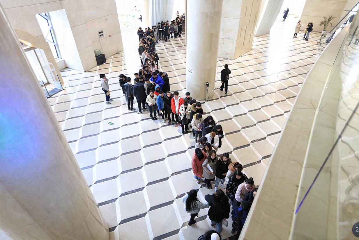 郑州西亚斯学院图书馆被考研学子里三层外三层围住。