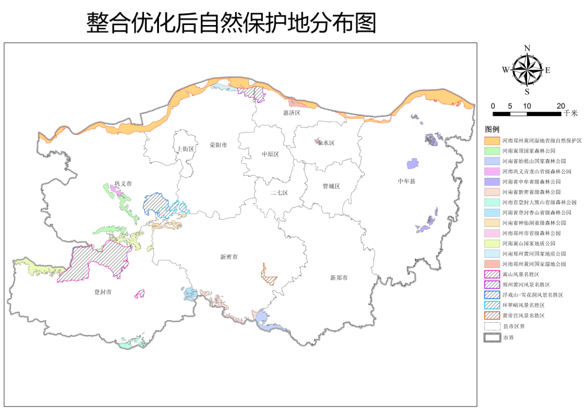 整合优化前,郑州市共有自然保护地25个,总面积147284.37公顷,包括自然保护区1个,风景名胜区5个,森林公园16个,地质公园2个,湿地公园1个。依据整合优化规则,3个自然保护地并入其他自然保护地,2个自然保护地拆分后并入其他自然保护地,撤销自然保护地2个。