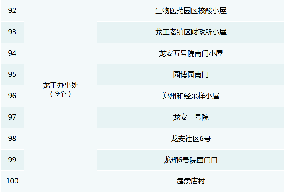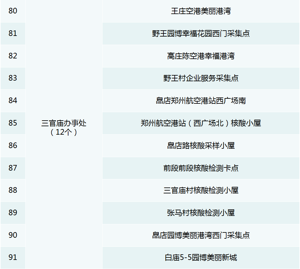 为切实保障有核酸检测需求的群众得到安全、有序、便捷的核酸采样服务,现将自2022年12月9日起,郑州航空港经济综合实验区各乡(镇)办事处开放的便民核酸采样屋公布如下,请有检测需求的群众科学安排时间,错峰、错时、就近前往采样。采样时间统一为上午8点到下午14点。