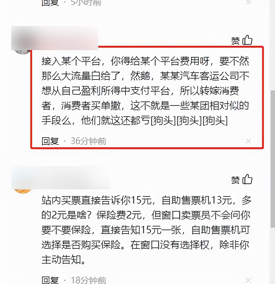 还有网友评论说:“接入某个平台,得给某个平台费用呀,然而,某某汽车客运公司不想从自己盈利所得中支付平台费用,所以转嫁给消费者,让消费者买单。”