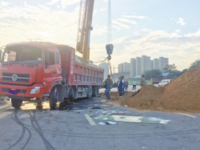 郑州信号灯故障两货车相撞 30吨沙倾撒一地