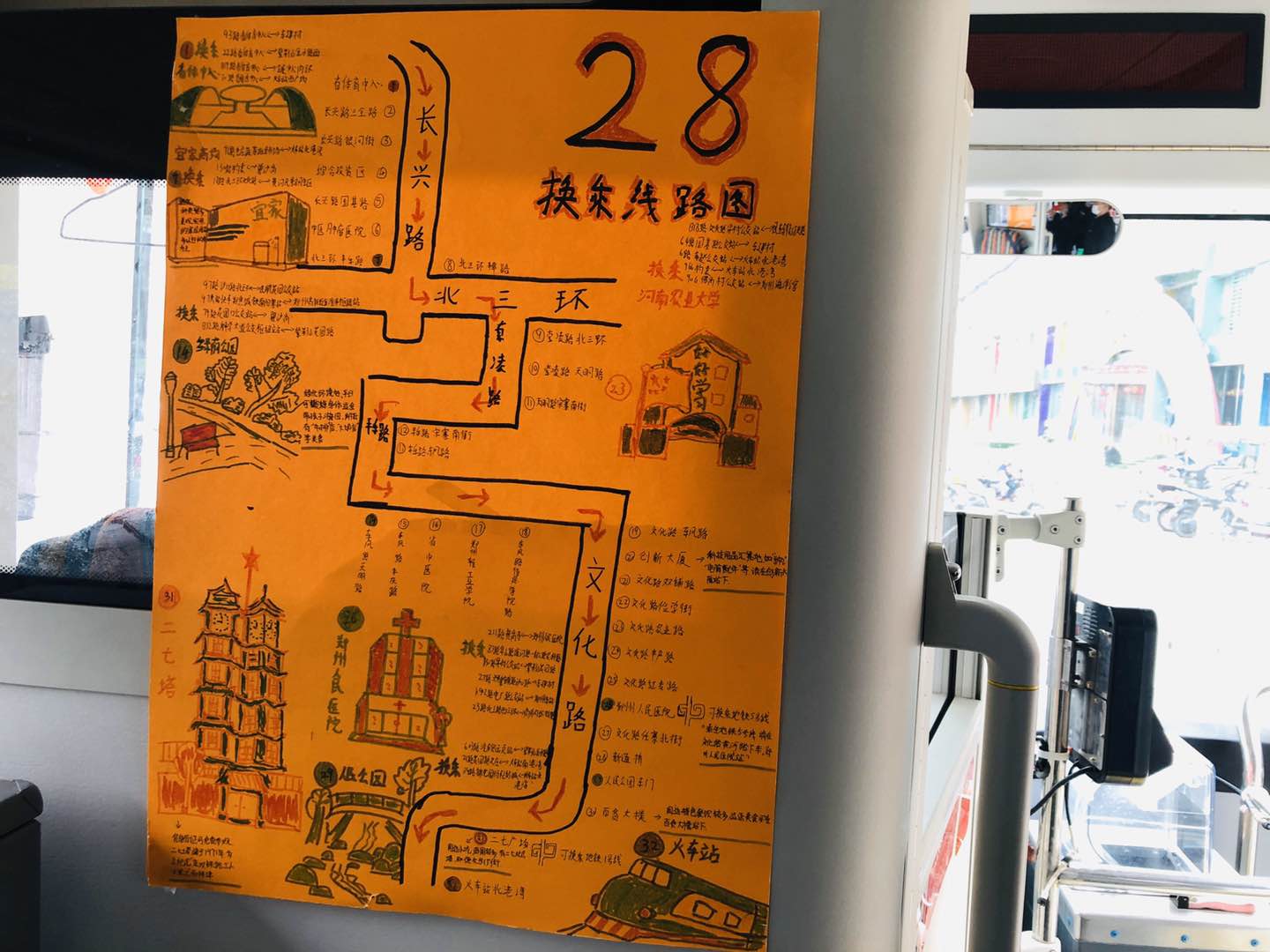 6日当天,经常乘坐28路公交车出门的胡先生一上车,就在驾驶室后方的挡板上发现了一张很别致的“地图”,上面标注着28路的所有站点以及周边的著名建筑,很是详尽。