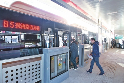 昨日,记者跟随市民“试乘”,发现B5路沿线快速公交站台全部采用先进的屏蔽式闸机。站台工作人员介绍说,每个站台均设有6台闸机5个进出站通道。“另外,不管从哪个方向过来的车,乘客只需要记住有一点不同,公交车都是朝左进站,公交车左侧开门。”快速公交工作人员提醒,不仅是B5路实行左侧开门,与B5路接驳和免费换乘的189路,以及将来要进入B5免费换乘系统的1路、13路、38路、82路、216路、603路都是左侧开门上下车。