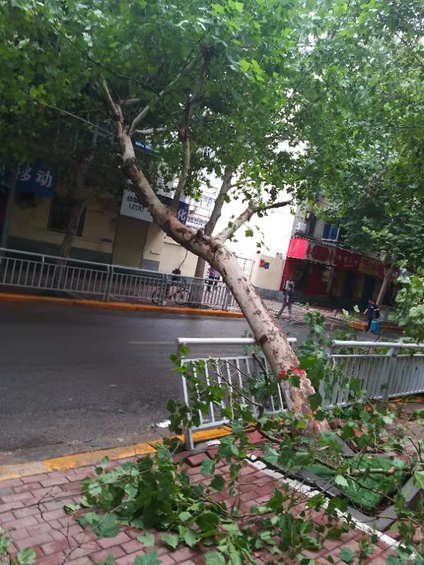 8月1日晚,郑州市康复前街一棵法桐树树根被连根拔起,如果不是因为路边护栏遮挡,此树会直接砸向马路上,十分危险。