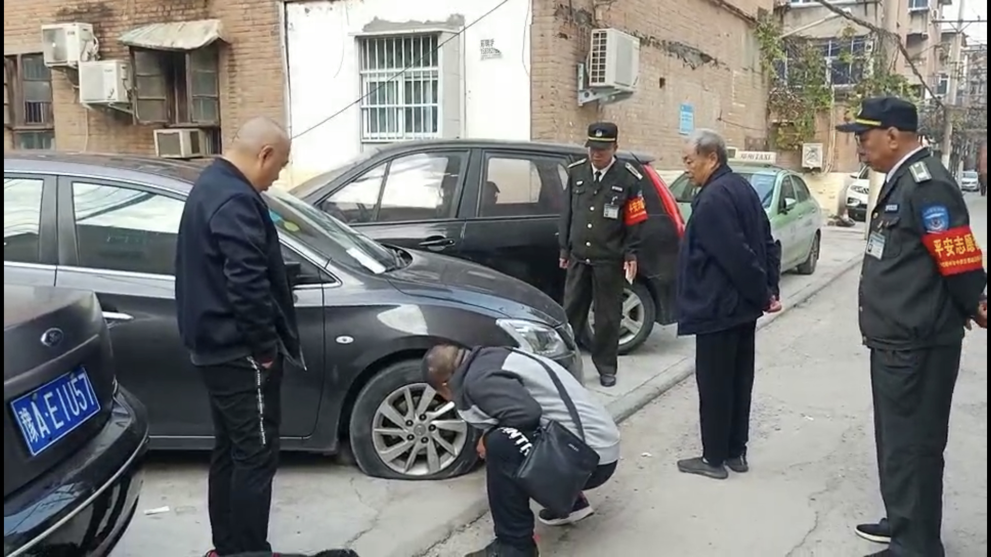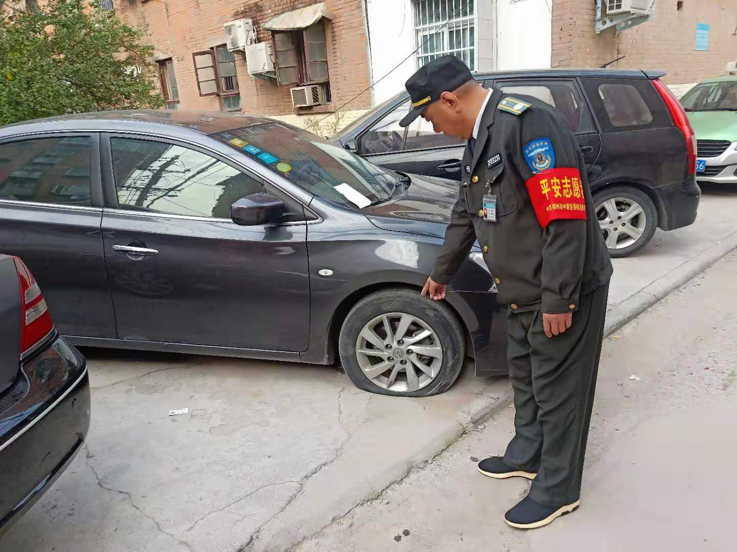 10月23日上午8时许,中原区建设路街道办事处前进路社区的巡防队员李勇等人,巡逻到前进路50号院2号楼旁,有居民向他们反映,一辆停在楼前的黑色轿车两个前轮的轮胎,可能被人扎了,两个轮胎已经瘪掉,导致轿车“趴”在地上。