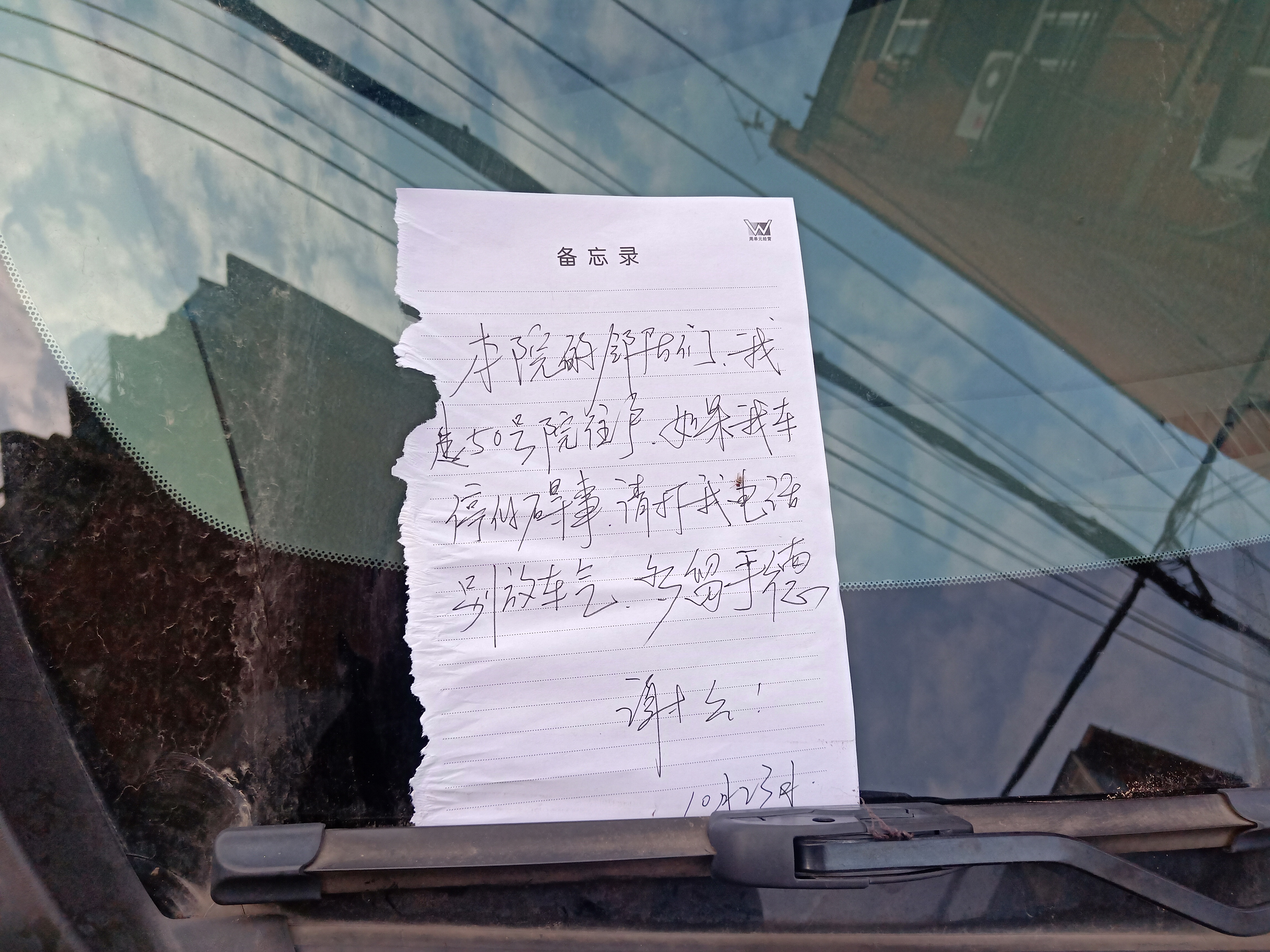 采访中记者看到,被扎烂车胎的轿车上,确实留着一张字条,上面写着:“本院的邻居们,我是50号院住户,如果我车停的碍事,请打我的电话,别放车气,多留手德。谢谢!”然而,车主留的这张字条并未使他的轿车免遭“黑手”。