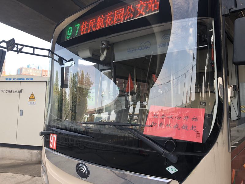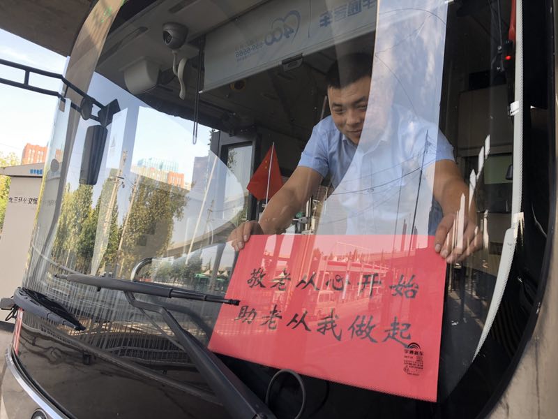 10月7日,郑州市97路公交车的车头全部张贴了“爱老从心开始 助老从我开始”的宣传标语、老年乘客乘车注意事项。