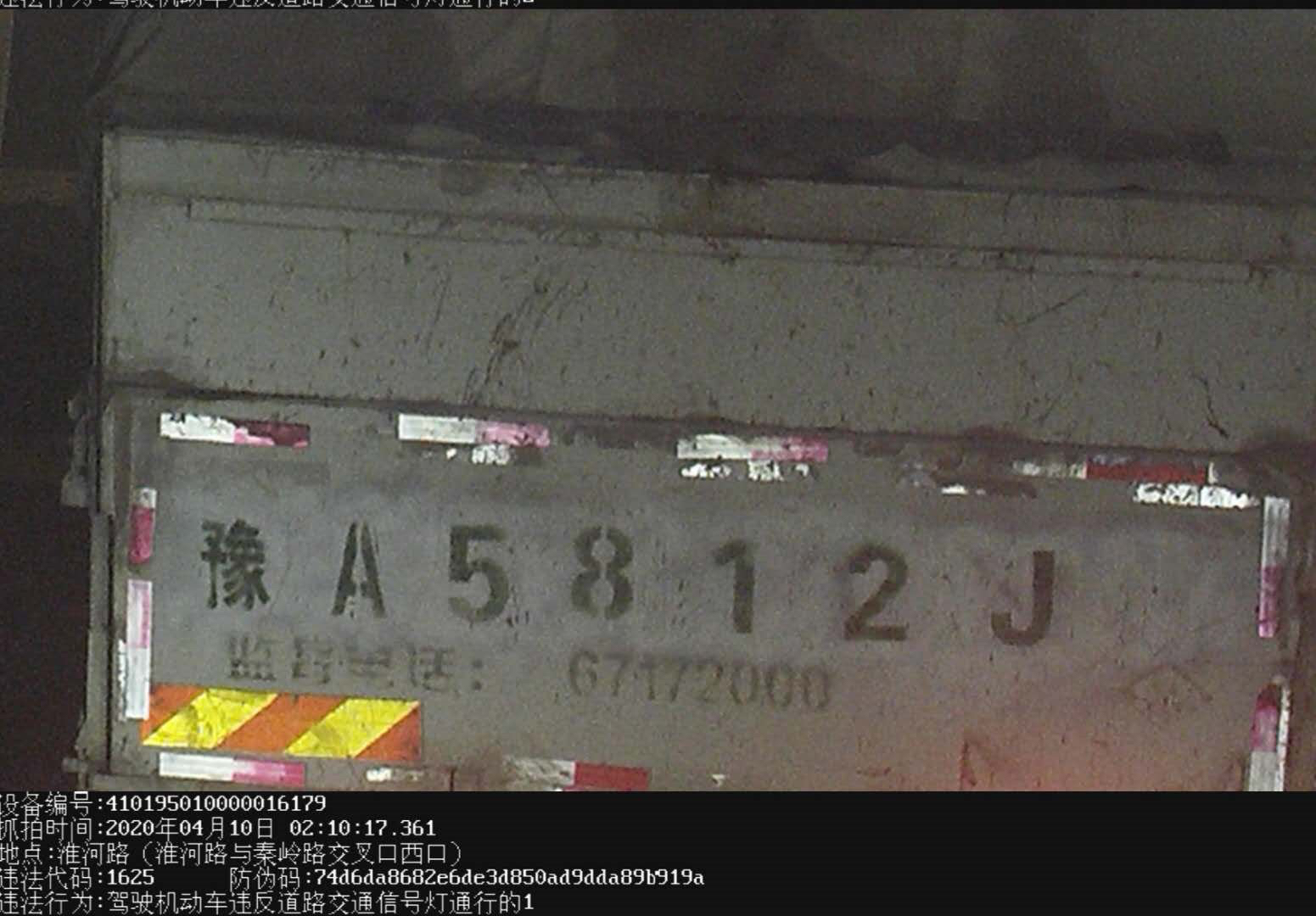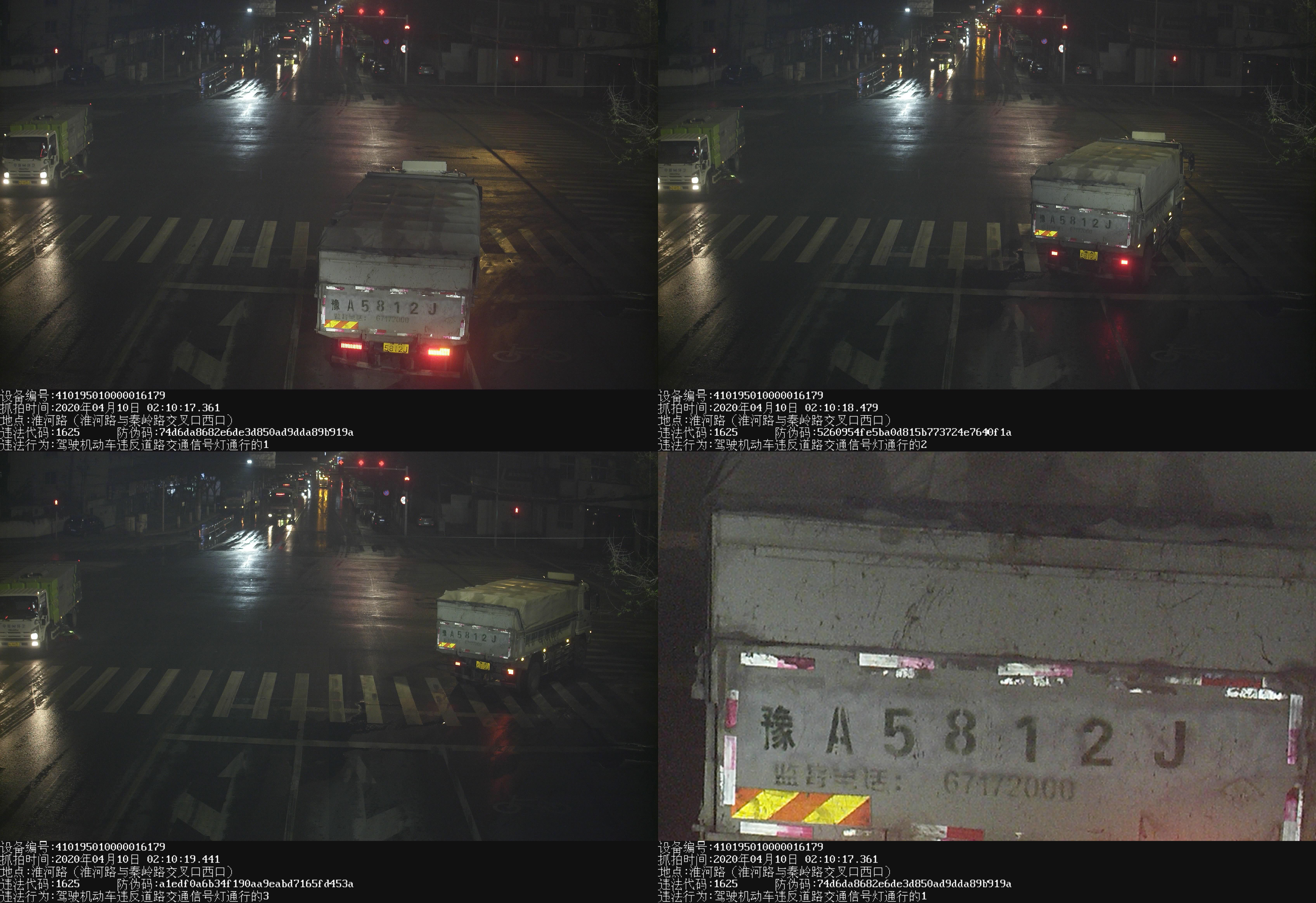 四、2020年4月10日02:10,豫A5812J重型货车在淮河路与秦岭路交叉口闯红灯,驾驶员申某到交警二大队接受处理,承认违法事实,民警对申某做出200元罚款,记6分的处罚。