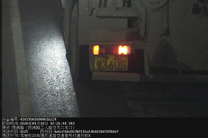 三、2020年4月14日02:26,豫A9360G重型货车在陇海路工人路交叉口闯红灯,驾驶员刘某到交警二大队接受处理,承认违法事实,民警对刘某做出200元罚款,记6分的处罚。
