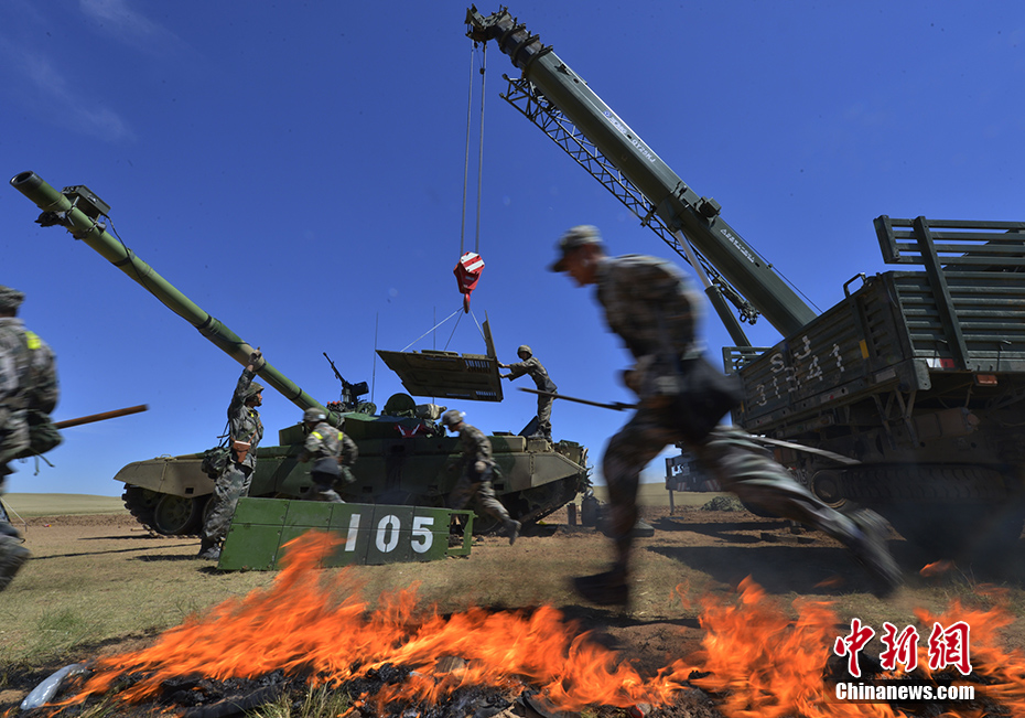 十八大以来,中国军队聚焦新形势下的强军目标,在政治建军、改革强军、科技兴军、依法治军的征程上,不断突破进取。火箭军锻造战略重拳,航母编队出海跨区集训,抗战胜利70周年大阅兵振奋全球华人,朱日和沙场阅兵一展铁军本色。走过90年光辉历程的威武之师,正朝着建设世界一流军队的目标砥砺奋进。图为2014年7月3日,参加“跨越2014――朱日和D”实兵演习在即,沈阳军区16集团军某旅对战损装备实施快速抢修。