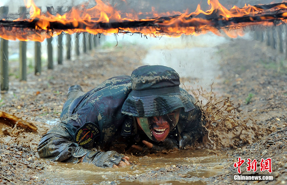 十八大以来,中国军队聚焦新形势下的强军目标,在政治建军、改革强军、科技兴军、依法治军的征程上,不断突破进取。火箭军锻造战略重拳,航母编队出海跨区集训,抗战胜利70周年大阅兵振奋全球华人,朱日和沙场阅兵一展铁军本色。走过90年光辉历程的威武之师,正朝着建设世界一流军队的目标砥砺奋进。图为2016年8月15日,在中国人民解放军火箭军“常规导弹第一旅”训练场上,全副武装的战士在高温酷暑中匍匐穿越火线。