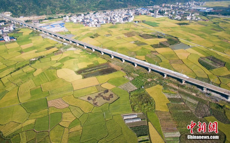 2017年中国环境日的主题是:“绿水青山就是金山银山”,旨在动员引导社会各界保护自然环境,践行循环发展,共同建设美丽中国。五年来,生态文明建设受到前所未有的重视,绿色发展和绿色生活成为大势所趋。“草木植成,国之富也。”当生态优势转变为经济优势,当美丽风景带来崭新动能,“生态红利”、“生态反哺”效应愈加显著。图为2016年10月4日,一列动车行驶在贵广高铁贵州省榕江县郊外田野高架桥上。从空中俯瞰,色彩斑斓的稻田,犹如秋天绘制的“调色板”。中新社记者 贺俊怡 摄