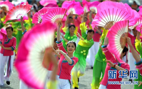 这是市民在2019年全国“全民健身日”活动河南省分会场表演健身秧歌(8月8日摄)。新华社记者 李嘉南 摄