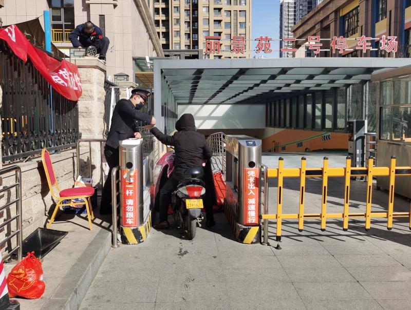 在该小区东侧停车场处,记者注意到,人员从西半侧出入,车辆从东半侧进出,中间有护栏隔离着。门口有几名工作人员正在值班。