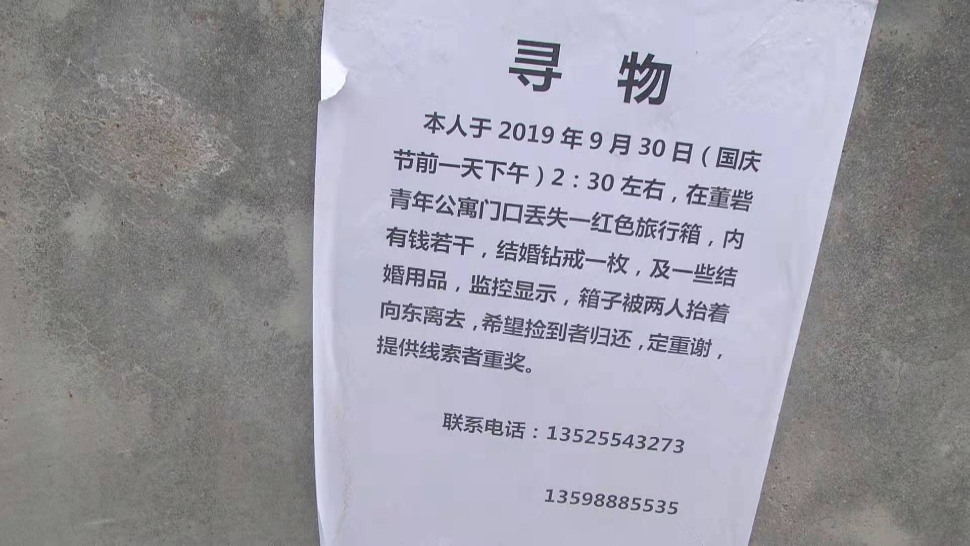据巡防队员陈亮介绍,国庆节期间,他和队友张杰巡逻到西站路与冉屯东路交叉口时,发现路边矮墙上贴着一张寻物启事,上面写着:本人与9月30日下午2时30分左右,在董砦青年公寓门口丢失一红色旅行箱,内有钱若干,结婚钻戒一枚及一些结婚用品。监控显示,箱子被两人抬着向东离去,希望捡到者归还,定重谢,提供线索者重奖。