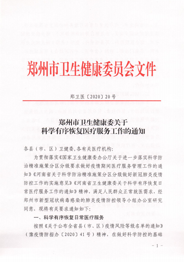 通知称,按照《关于公布全省县(市、区)疫情风险等级名单的通知》(豫疫情防指办〔2020]41号)精神,在做好科学防控的基础上,全市将逐步、有序恢复日常医疗服务和公共卫生服务工作。在无偿献血逐步恢复、血液供应得到保障情况下,逐步恢复择期手术。