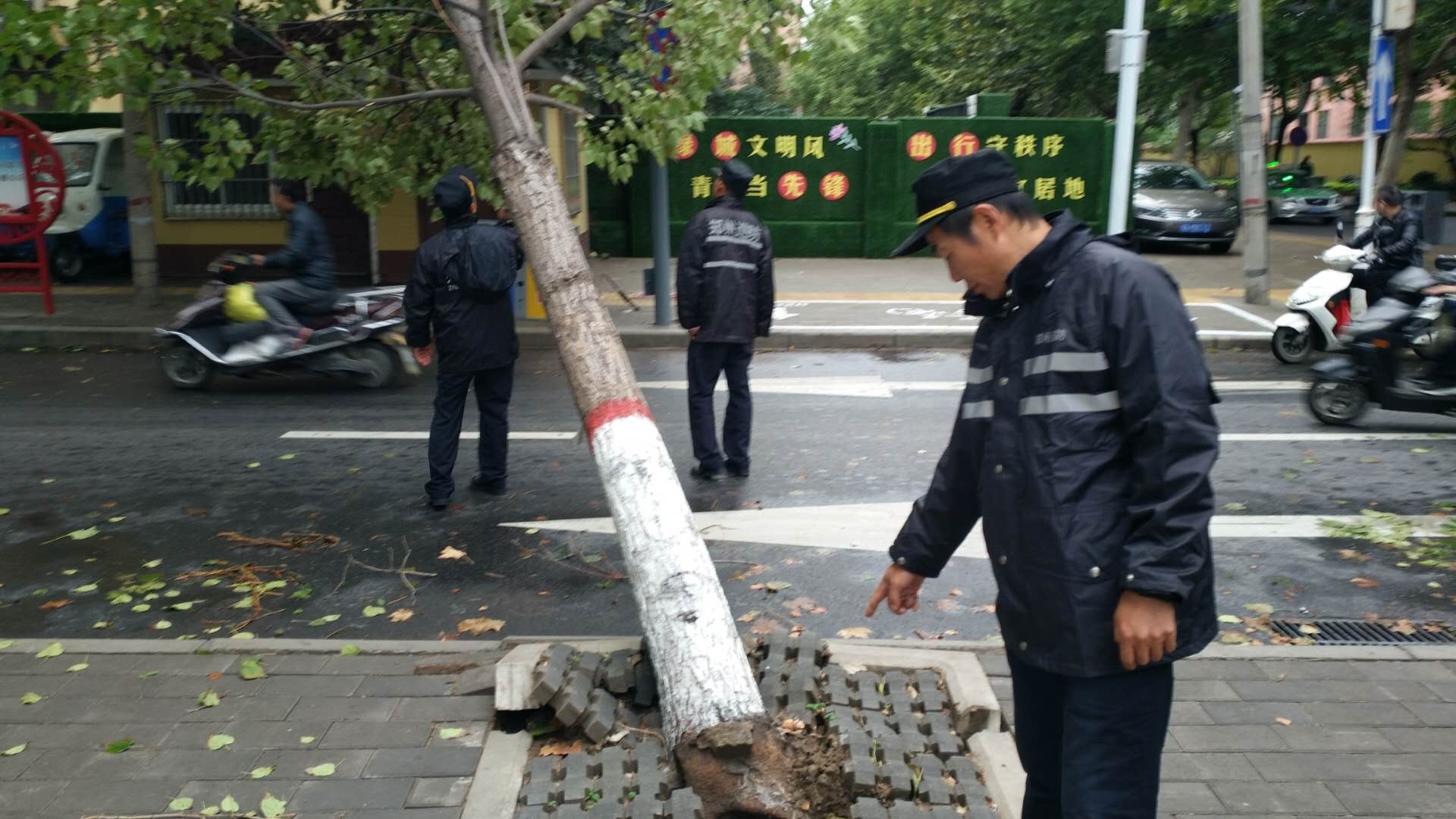 在路上巡逻时金水区文化路街道办事处巡防队员秦苏荣、高新伟、朱增强见状,忙上前疏导交通。这棵碗口粗的行道树,被从根部折断,树根从泥土中祼露出来。为了尽快消除安全隐患,使道路恢复畅通,队员立即拨打了城建热线,希望绿化部门前来处理,并在周围拉上了警戒线。