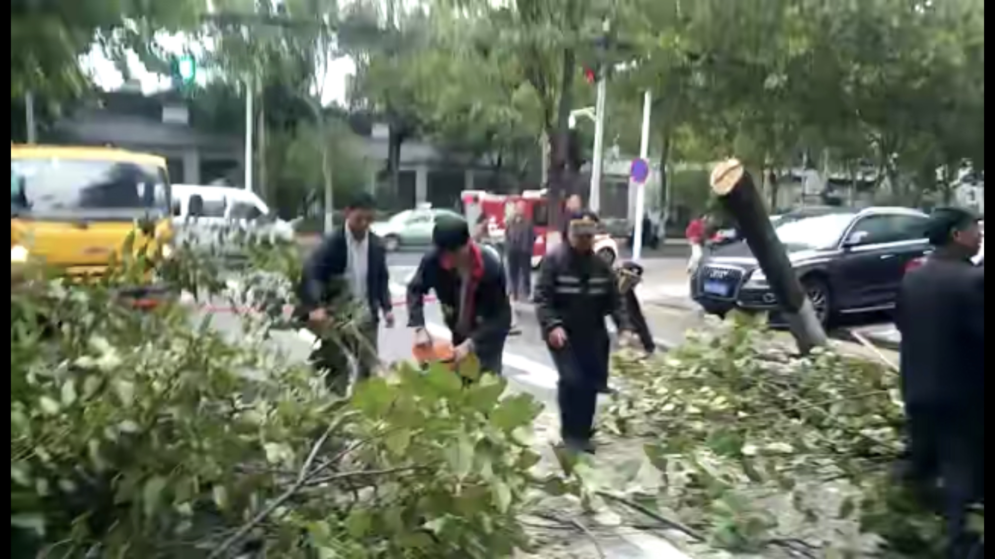 郑州一行道树被刮倒悬在路中间,行人吓得不敢通行