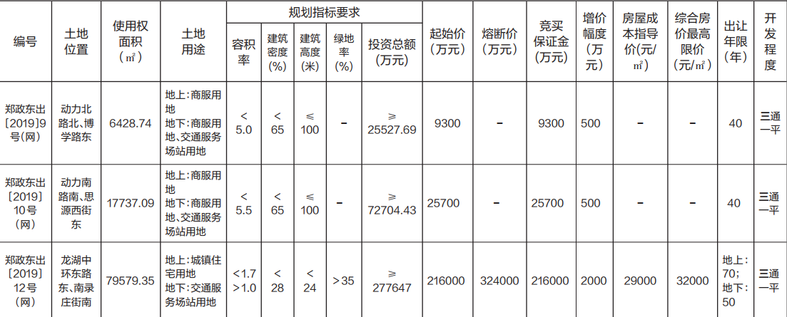 大河财立方消息 10月19日,郑州市自然资源和规划局、郑州市国土资源局郑东新区分局决定以网上挂牌方式出让郑州综合交通枢纽区域郑政东出〔2019〕9、10号(网)、郑东新区龙湖区域郑政东出〔2019〕12号(网)地块的国有建设用地使用权,并与郑州市公共资源交易中心联合发布公告。