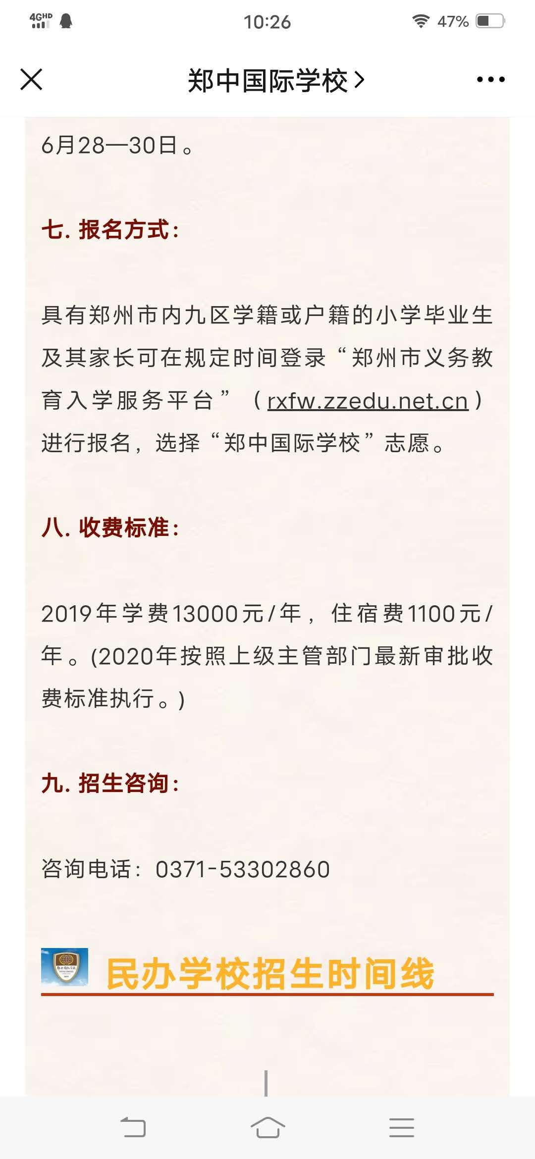 记者注意到,在“小升初”2020年郑州市郑中国际学校招生简章收费标准显示:2019年学费确实是13000元/年,住宿费1100元/年。(2020年按照上级主管部门最新审批收费标准执行。)