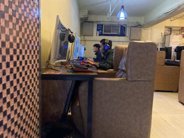记者发现,除了没有门头,进到屋内就和常见的网吧没有区别,收银台处有学生正在排队交钱上网,门口有几十台机器,顺着过道往里走,左右两边10平方大的房间有六七个,每个房间里有五六台机器,没有窗户,昏暗的房间内一个男孩还抽着烟,机器旁边用过的饭盒里,堆着不少烟头。