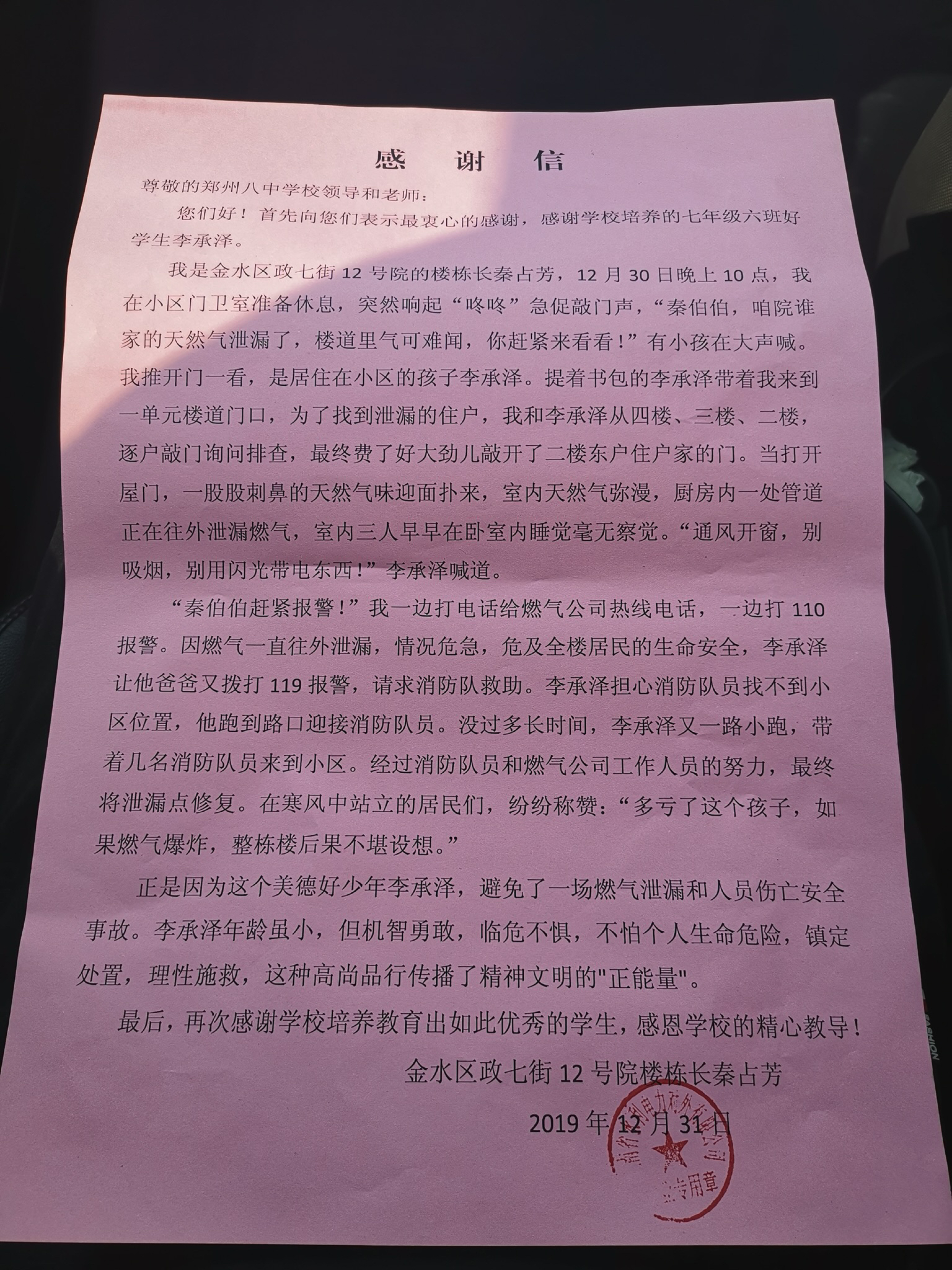 “尊敬的郑州八中学校领导和老师,您们好!首先向你们表示最衷心的感谢,感谢学校培养的好学生李承泽……”2019年12月31日上午,作为楼栋长,门卫秦师傅代表小区居民来到郑州八中,送去一封感谢信,感谢该校七年级六班学生李承泽及时发现天然气泄漏,并积极帮助疏散邻居,避免了更大事故的发生。