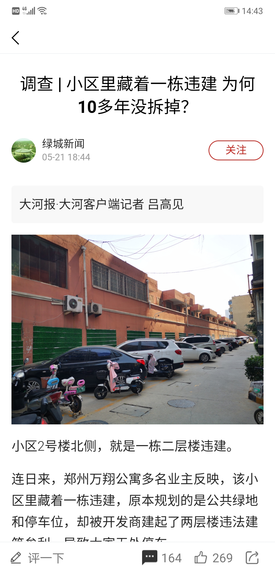5月21日,大河报•大河客户端报道了郑州万翔公寓多名业主反映,称该小区里藏着一栋违建,原本规划的是公共绿地和停车位,却被开发商建起了两层楼违法建筑牟利,导致大家无处停车。