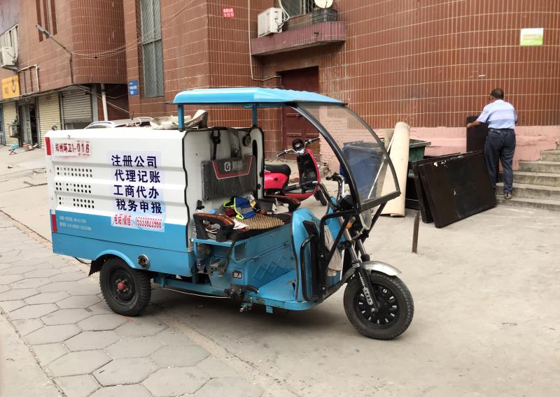 8月14日上午11点多,按照市民指引,记者在关虎屯小区找到了这辆车。车身上写着“郑州环卫”,后面并有编号。白蓝相间的车身侧面,张贴着“注册公司,代理记账”等内容的广告,下方并留有联系方式。在车的另一侧,也同样贴着该广告。大大的字体,看上去很是显眼。