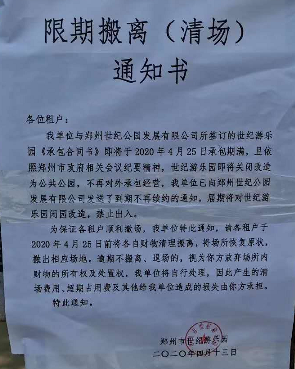 这份盖有“郑州市世纪欢乐园”红章的通知书称:“我单位与郑州世纪公园发展有限公司所签订的世纪游乐园《承包合同书》即将于2020年4月25日承包期满,且依照郑州市政府相关会议纪要精神,世纪游乐园即将关闭改造为公共公园,不再对外承包经营,我单位已向郑州世纪公园发展有限公司发送了到期不再续约的通知,届期将对世纪游乐园闭园改造,禁止出入。”