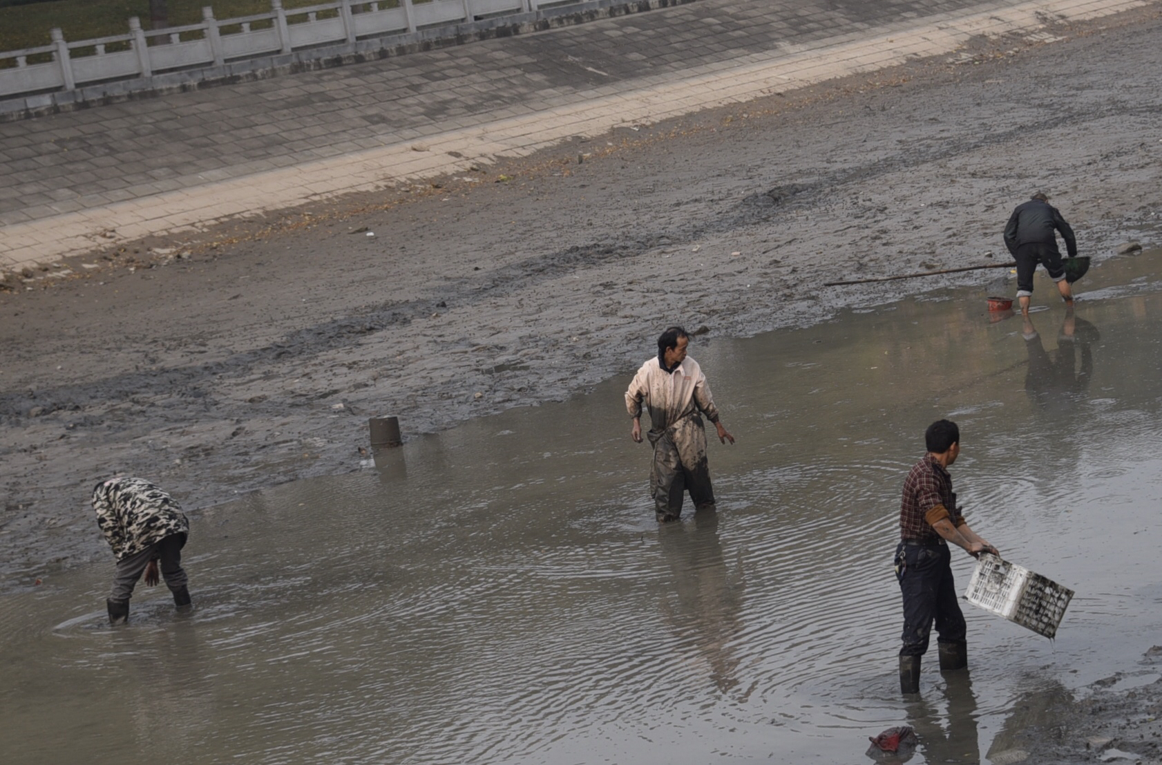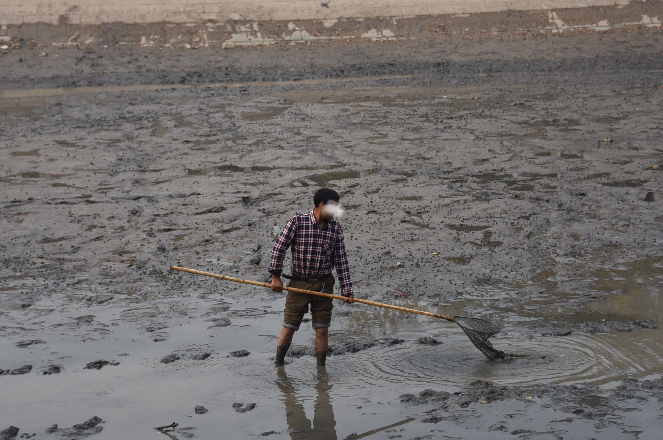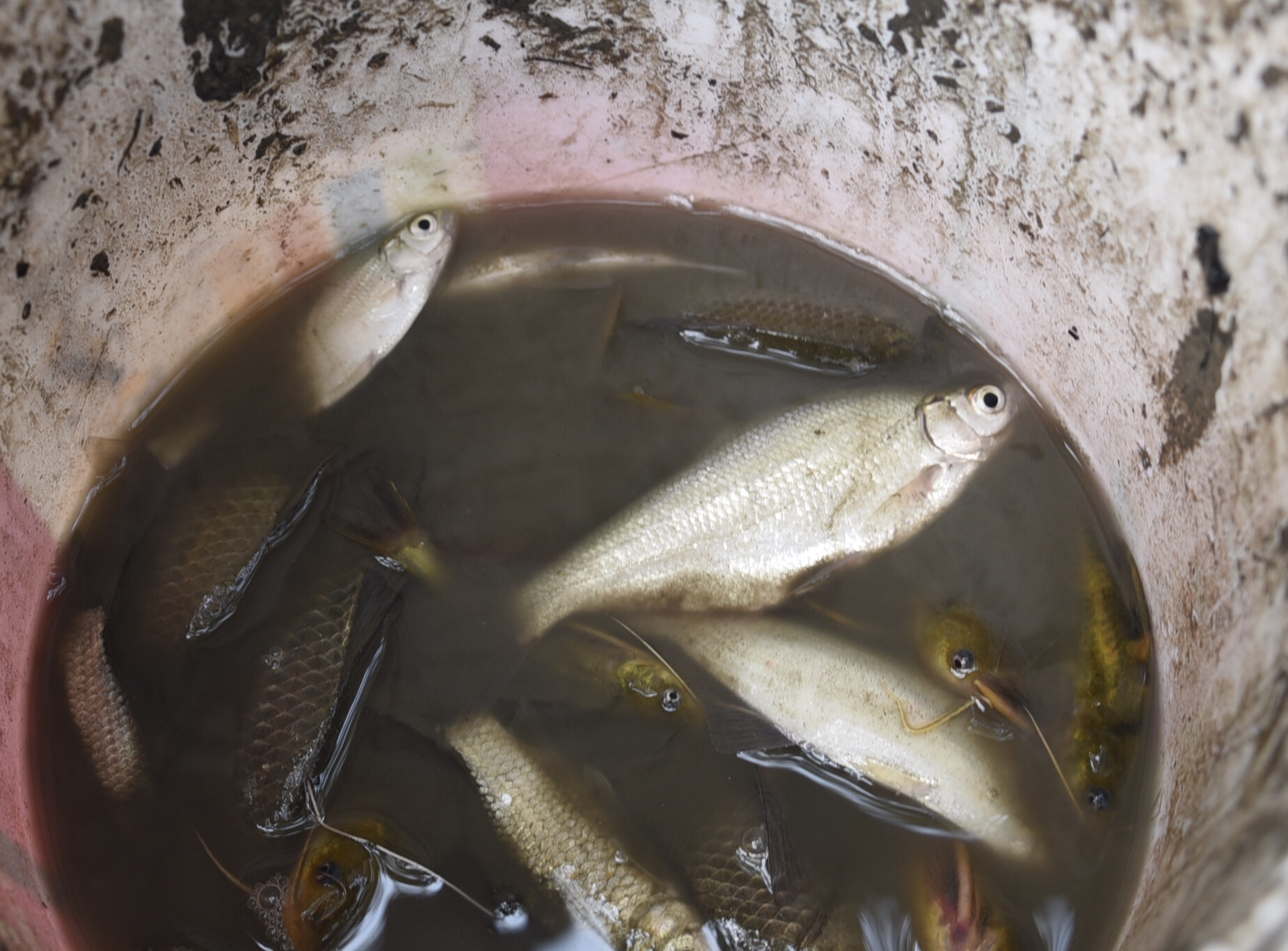 河底的淤泥很深,捕鱼者下去后,有的被淤泥没过膝盖,但他们并不害怕,反而乐在其中。淤泥上,散落着密密麻麻的的螺蛳,却没有人捡拾。捕捞的小鱼大部分活着,多为小鲫鱼。